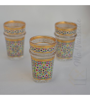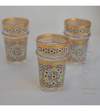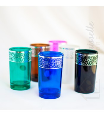 Service de 12 verres à thé Style: marocain traditionnel , intemporel, Couleurs: marron, bleu, vert, noir, blanc et rose Motifs: argentés, oriental Contenance: 180ml...