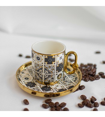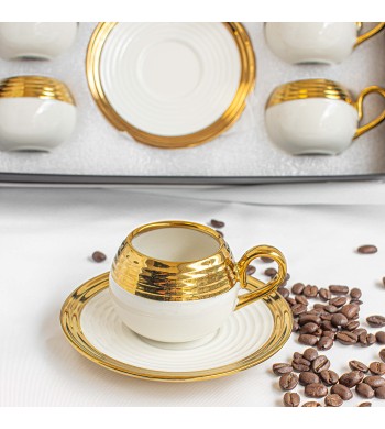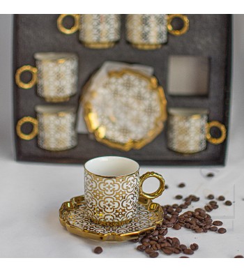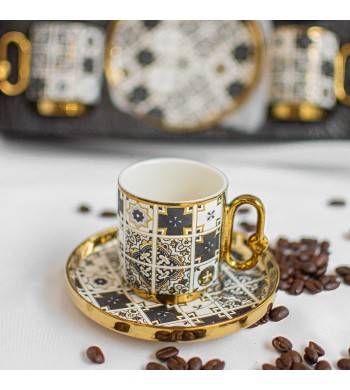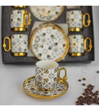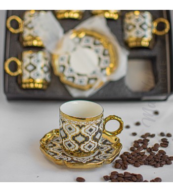 Service a café complet Le service comprend : 6 tasses et 6 sous tasses Matériau: céramique Couleur: blanc/gris/doré Dimension des tasses: hauteur 6cm, diamètre 5cm...