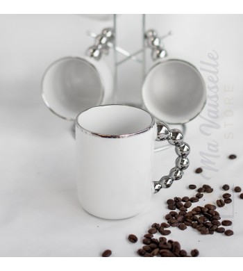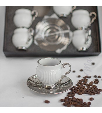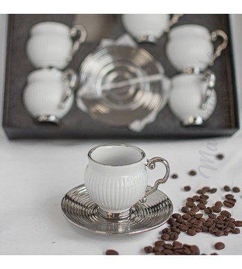 Service a café complet Le service comprend : 6 tasses et 6 sous tasses Matériau: céramique Couleur: blanc/argenté Dimension des tasses: hauteur 5cm, diamètre 6cm...