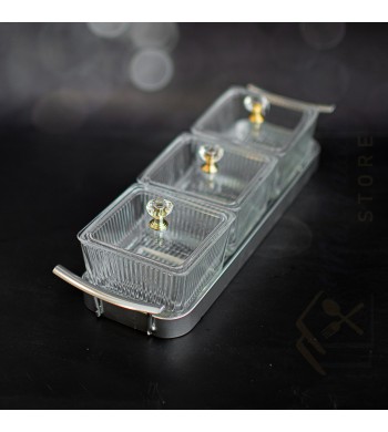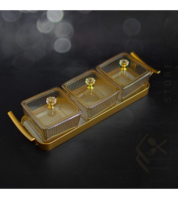 Plateau apéritif 3 compartiments Coupelles en verre avec couvercles PVC Couleur: doré ou argenté au choix Dimensions: 32*10cm Dimension des coupelles: 9*9cm Les...