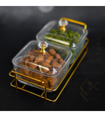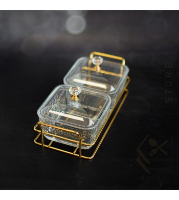 Plateau apéritif 2 compartiments Coupelles en verre avec couvercles PVC Couleur: transparent et doré Dimensions: 22*10cm Dimension des coupelles: 9*9cm Les coupelles...
