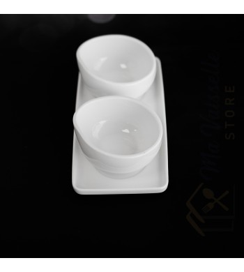 Plateau apéritif 2 compartiments Matériau: céramique Couleur: blanc Dimensions: 22*10cm Diamètre des coupelles: 9cm Les coupelles sont utilisables indépendamment du...