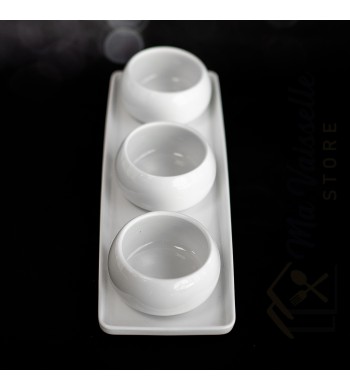 Plateau apéritif 3 compartiments Matériau: céramique Couleur: blanc Dimensions: 28*10cm Diamètre des coupelles: 9cm Les coupelles sont utilisables indépendamment du...