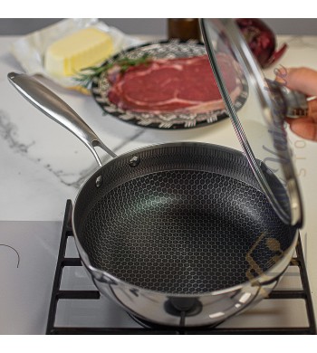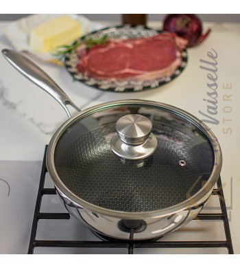 Casserole haute qualité Couvercle transparent en verre Acier inoxydable avec revêtement alvéolé nid d'abeille anti adhérent et anti rayures La structure nid d'abeille est...
