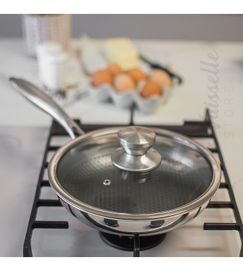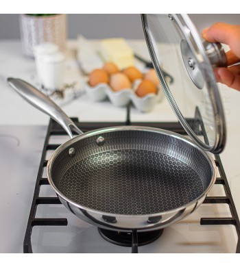 Poêle de haute qualité Couvercle transparent en verre Acier inoxydable avec revêtement alvéolé nid d'abeille anti adhérent et anti rayures La structure nid d'abeille est...