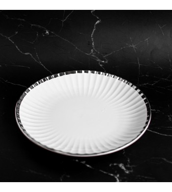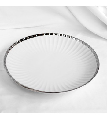 Plat en céramique ultra résistants Couleur: blanc avec liseré argenté Disponible en 3 tailles Idéal pour le service de tous vos plats familiaux aussi bien au quotidien...
