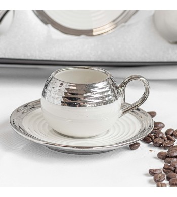 Service a café complet Le service comprend : 6 tasses et 6 sous tasses Matériau: céramique Couleur: blanc/argenté ou blanc/doré au choix Dimension des tasses: hauteur...