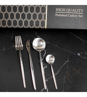 Ensemble de couverts 24 pièces comprenant: - 6 couteaux à diner - 6 cuillères à soupe - 6 cuillères à café - 6 fourchettes à diner Matériau: Acier...