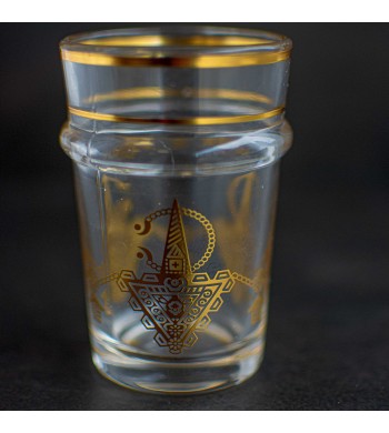 Set de 6 verres à thé Couleur: transparent avec motif doré Motif: emblème Amazigh Le set comprend 6 verres Dimensions: hauteur 10.5cm, diamètre 5.5cm Contenance: 170ml