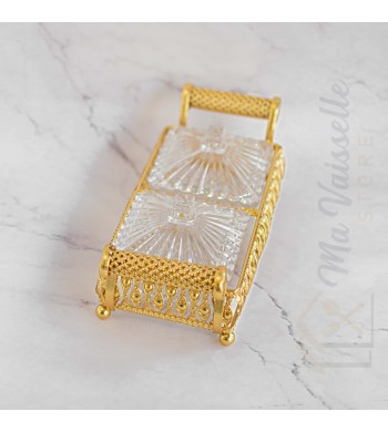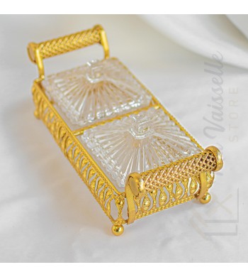 Plateau apéritif argenté 3 compartiments Matériau: céramique Couleur: blanc et argenté Dimensions: 32*10cm Dimension des coupelles: 9*9cm (hauteur 3cm) Les coupelles...