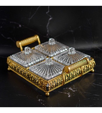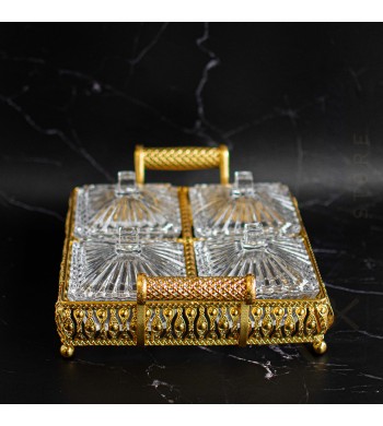 Plateau apéritif 4 compartiments Matériau: céramique Couleur: blanc Dimensions: 22*20cm Diamètre des coupelles: 9cm Les coupelles sont utilisables indépendamment du...