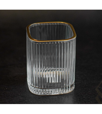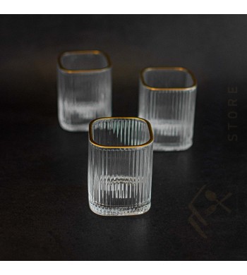 Lot de 6 verres Verre ultra résistant Forme: carrée Couleur: transparent avec liseré doré Contenance 150ml Dimensions: Hauteur 9cm, Diamètre 6cm Compatible lave...