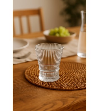 Lot de 6 verres Verre ultra résistant Couleur: transparent Effet: strié Contenance 150ml Dimensions: Hauteur 9cm, Diamètre 6cm Compatible lave vaisselle