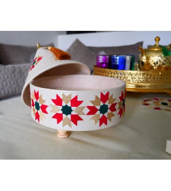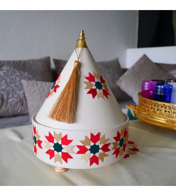 Tajine de présentation Style: traditionnel marocain Couleur: beige avec brodures rouge/vert/doré Utilisations: service du thé à la menthe, présentation de pains,...
