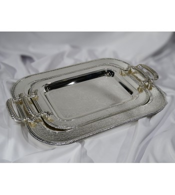 Lot de 2 plateaux en métal Couleur: argenté Forme: rectangulaire Poignées résistantes pour une prise en main facile et sécurisée Grand plateau 32*41cm Petit plateau...