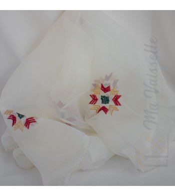 Voile de plateau Style: oriental, marocain, traditionnel Couleur: blanc avec bordures rouge/vert/doré Brodures traditionelles marocaines Idéal pour couvrir votre plateau...